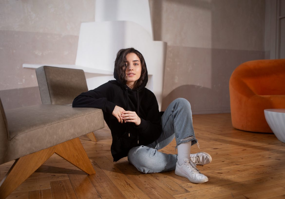 Matching color palette: Hoodie and sneakers in shades of one color.
