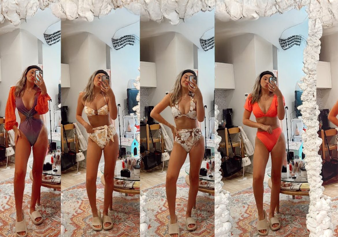 Fashion swimwear, bikinis, and one-piece suits for sunbathing or light swimming